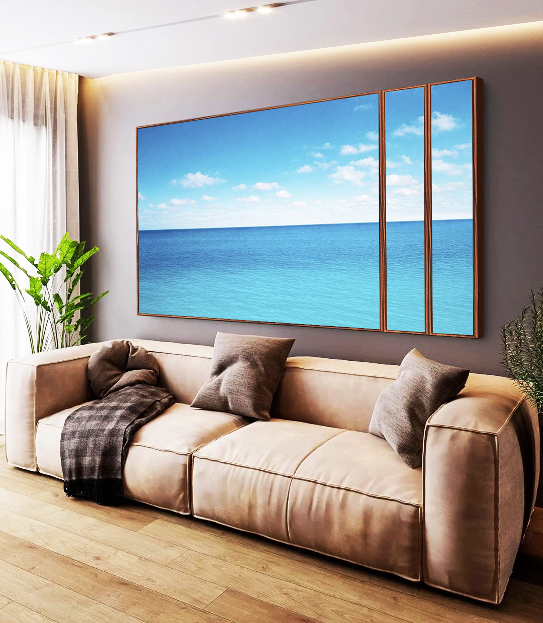 Sereno e sofisticado, este Trio de Quadros Estilizados com mar calmo azul e céu claro com nuvens transmite frescor e profundidade visual, criando atmosfera de paz. Ideal para decorar salas elegantes, quartos refinados ou escritórios modernos.