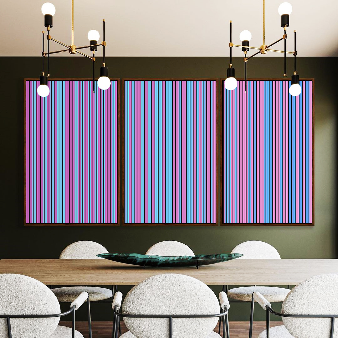 Elegante e moderno, este Trio de Quadros com listras em degradê azul e lilás cria um ponto focal delicado e sofisticado. Ideal para compor salas contemporâneas, quartos refinados, escritórios elegantes ou halls de entrada marcantes.