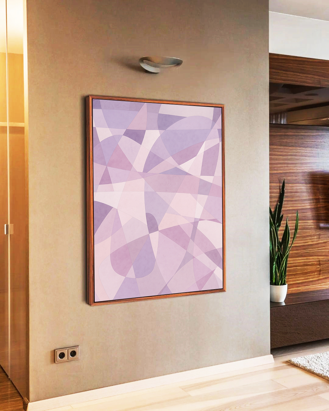 Quadro Vertical em tons de roxo, lavanda, rosa e branco que formam mosaico abstrato delicado. Moldura moderna garante requinte. Perfeito para sala de estar, quarto ou hall de entrada, enriquecendo a decoração com elegância.