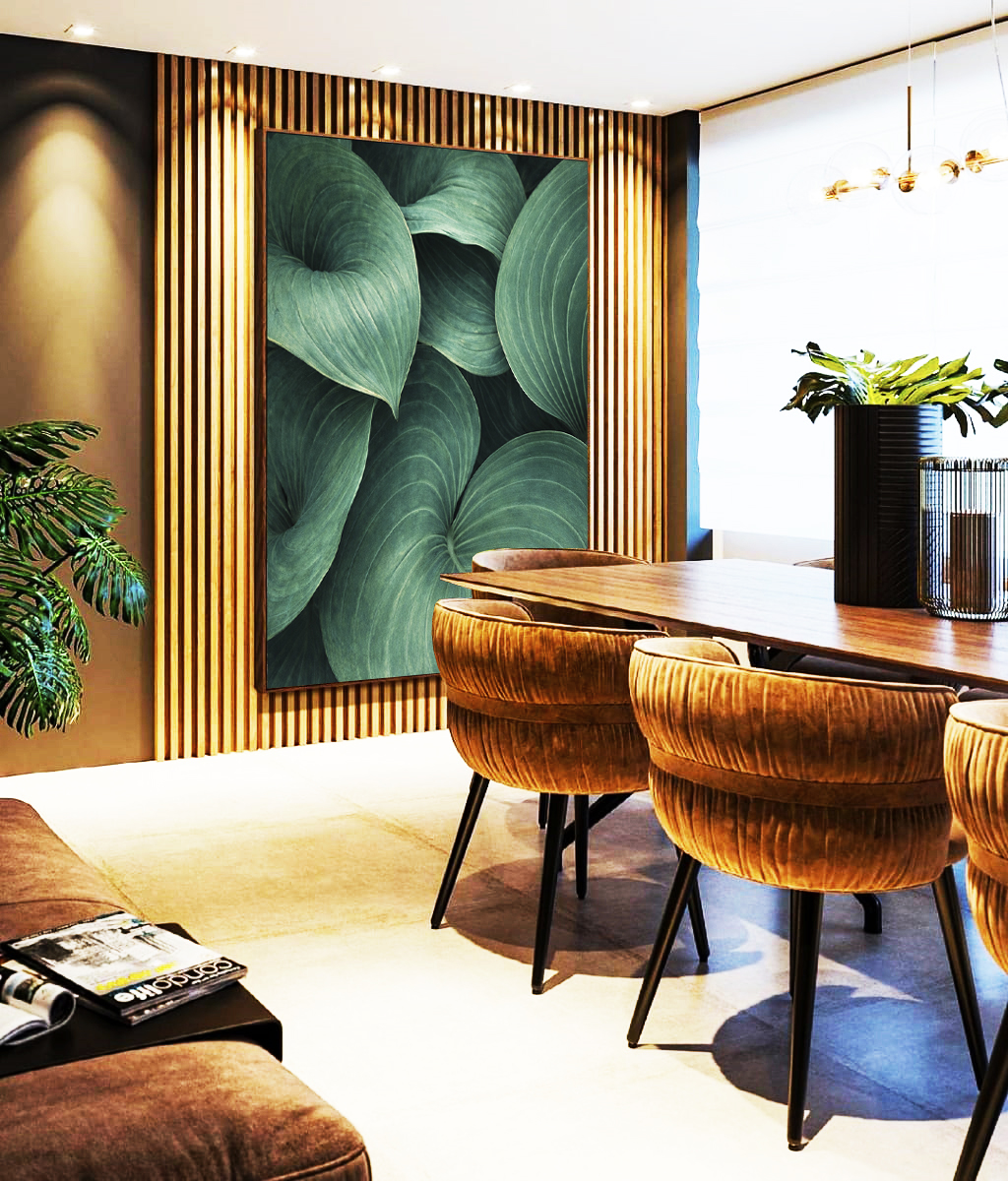 Este Quadro Vertical destaca folhas de Hosta em tons verdes intensos, criando um visual sofisticado e atemporal. Ideal para decorar salas de estar, quartos sofisticados, escritórios elegantes ou halls de entrada com identidade natural.