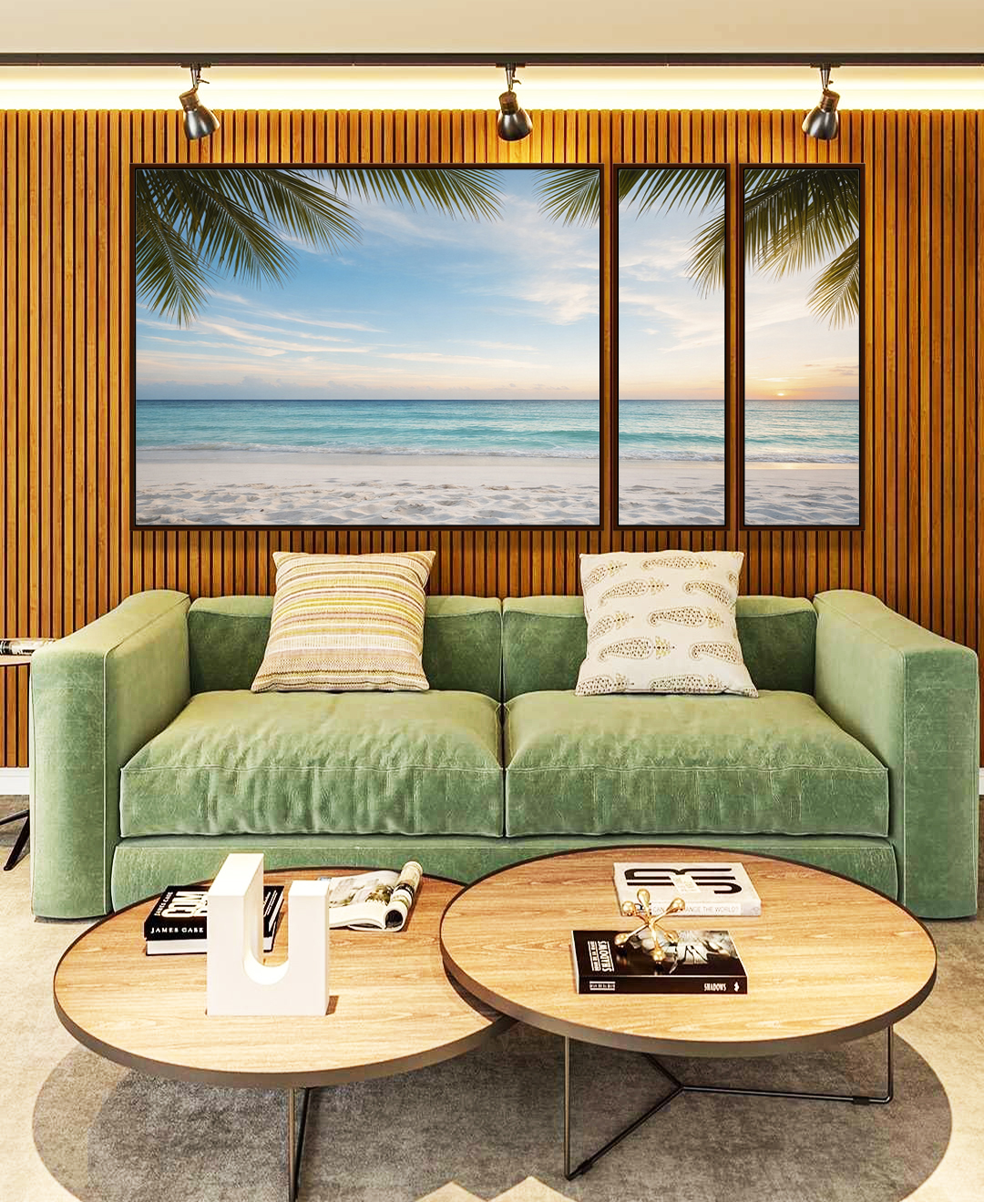Sol iluminando a areia clara, mar tranquilo e coqueiros ao vento, criando uma atmosfera leve e tropical. Ideal para sala, quarto ou espaços que pedem frescor e paz. Lindo e Iluminado!