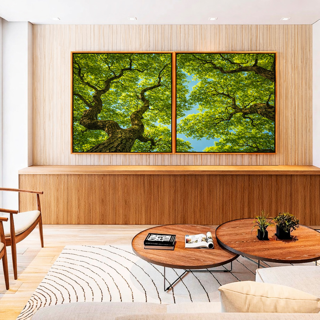 O verde das folhas em harmonia com o céu azul transmite calma e equilíbrio ao espaço. Perfeita para salas de estar, dormitórios, escritórios e ambientes que valorizam luz natural e serenidade.