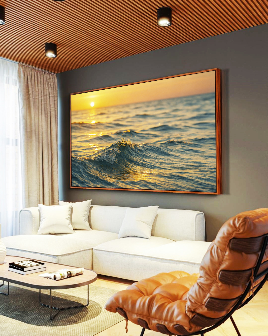 Pôr do sol sobre o mar com ondas suaves e brilho prateado que transmite paz e elegância. Ideal para sala de estar, quarto, escritório, consultório ou casa de praia. Perfeito para decoração litorânea, estilo contemporâneo e ambientes relaxantes.