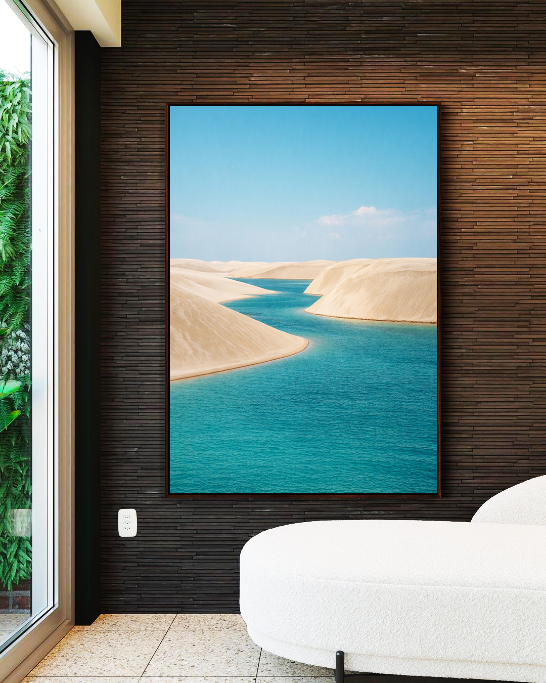 Dunas claras, água turquesa e céu azul formam uma paisagem paradisíaca de natureza leve e luminosa. Visual sereno que transmite frescor, tranquilidade e sensação de refúgio à beira-mar. Perfeito para salas, quartos e escritórios.