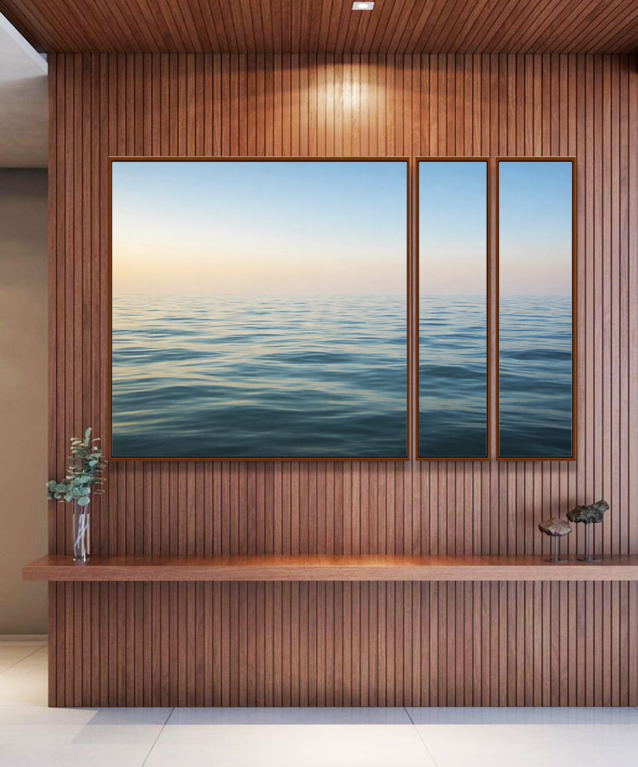 Trio de Quadros Estilizados Mar Sereno Azul e Céu Claro Natureza Canvas Moldura