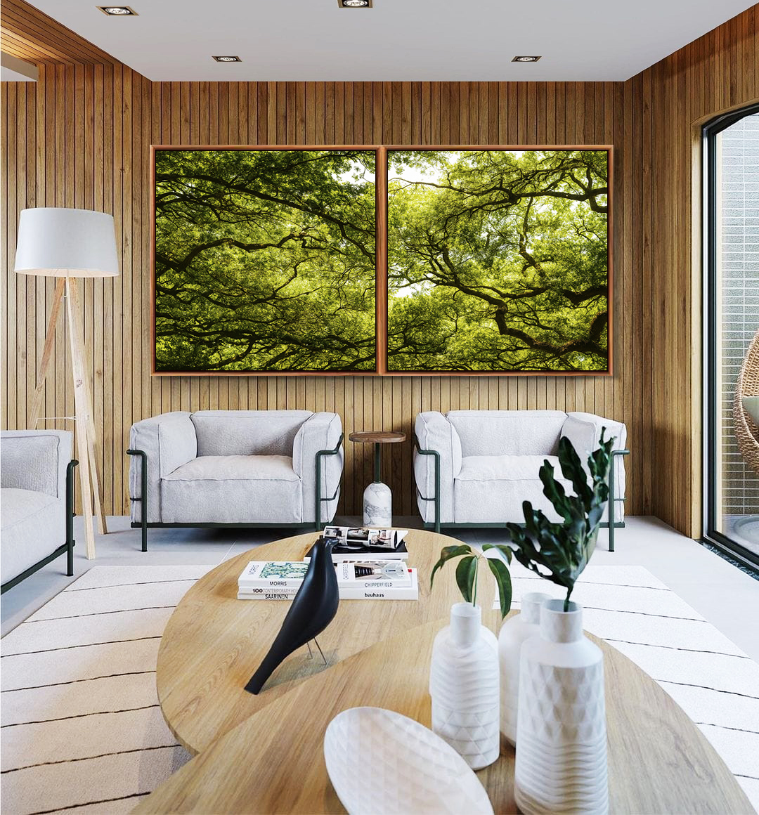 Leve e harmonioso, este Duo de Quadros Quadrados de natureza com folhas verdes e árvores em paisagem florestal cria um ponto focal sereno e sofisticado. Ideal para compor salas amplas, quartos refinados, escritórios elegantes.