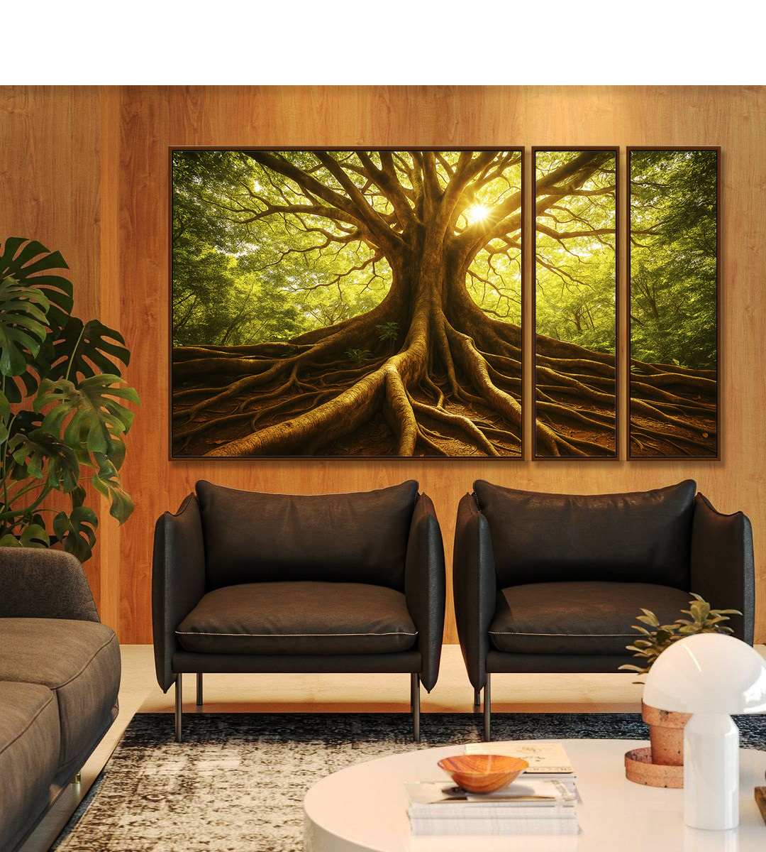 Este Trio de Quadros Estilizados se destaca pela beleza serena da natureza. O verde das folhas e o contraste da paisagem criam harmonia visual e leveza. Ideal para sala, quarto ou hall de entrada, trazendo frescor e sofisticação ao seu ambiente.