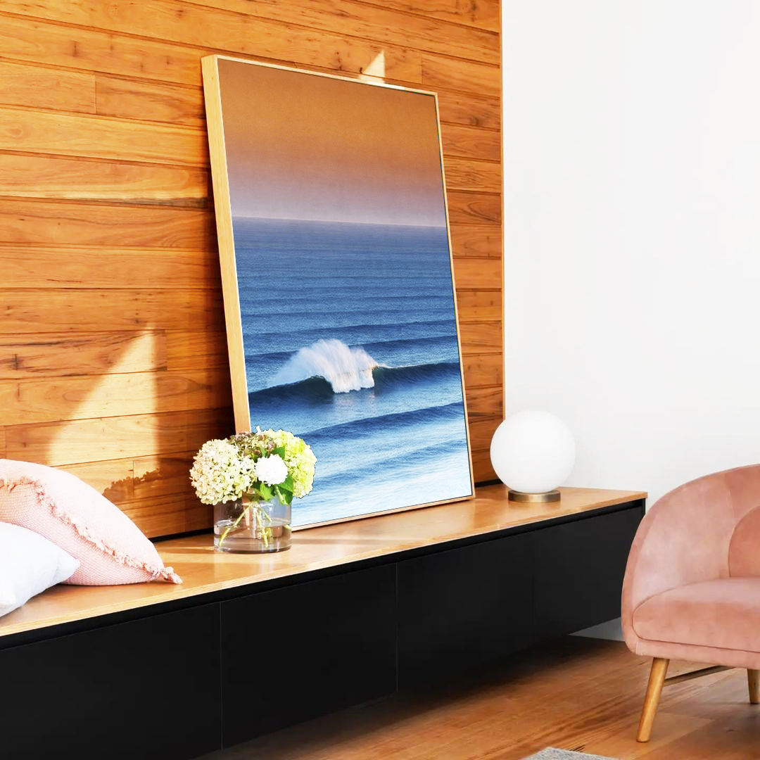 Ondulações no mar azul encontram o calor do pôr do sol laranja em uma Arte marcante. O Quadro Vertical é ideal para decorar salas de estar, escritórios sofisticados ou quartos, adicionando arte, profundidade e emoção à decoração.