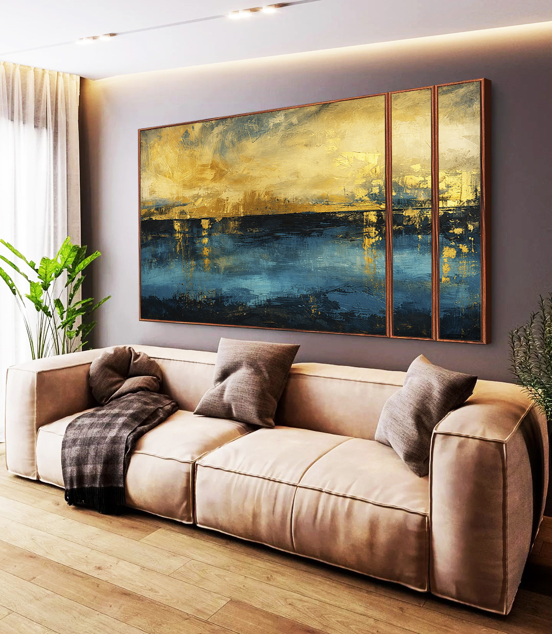 Trio de Quadros Estilizados Abstrato Amarelo Ouro Azul Petróleo Textura Canvas Moldura