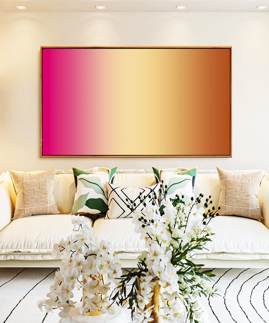 Um degradê elegante em rosa choque, bege e caramelo cria uma obra única neste Quadro Horizontal. Com moldura extra fina flutuante, é ideal para destacar salas de estar, quartos sofisticados ou escritórios modernos, trazendo estilo e harmonia.
