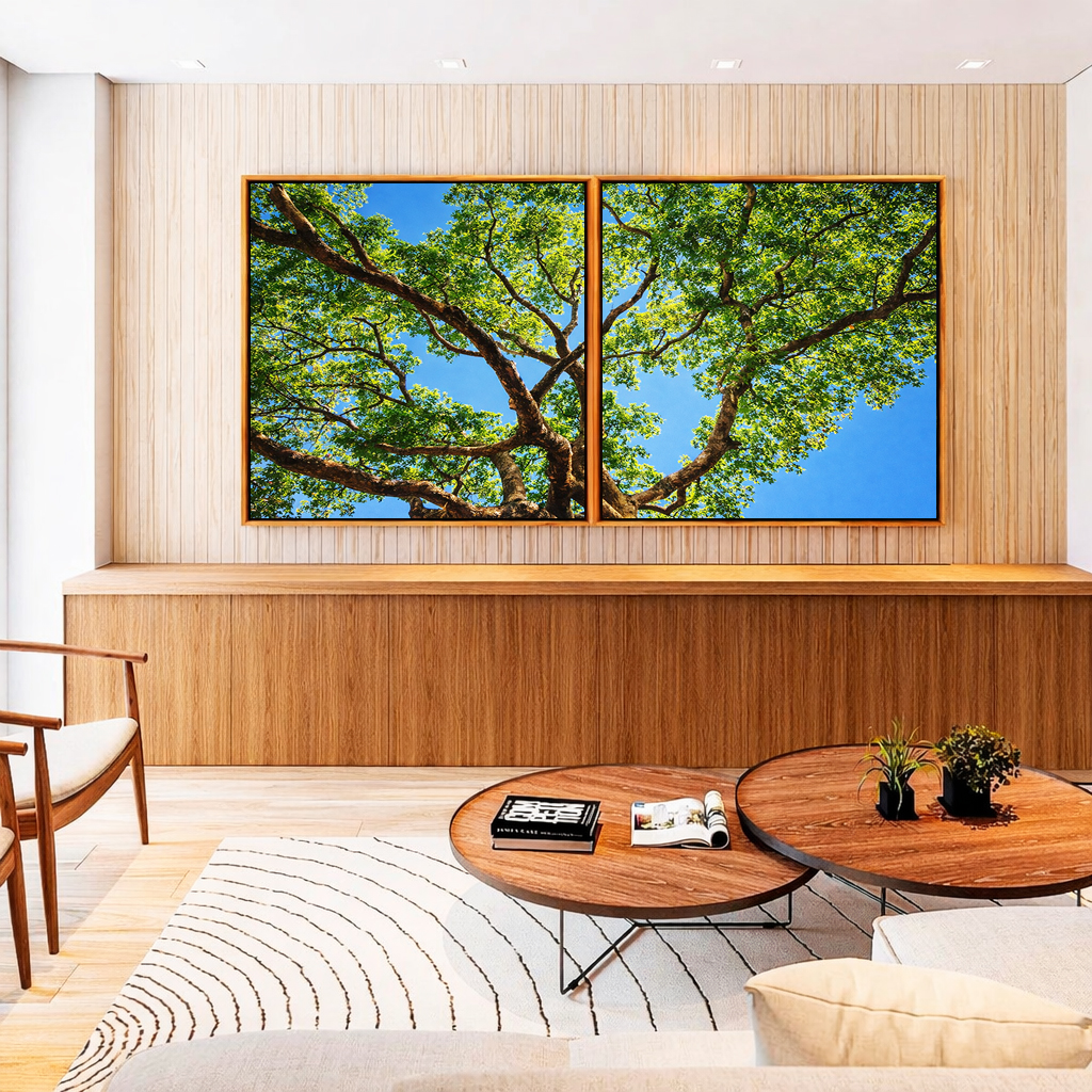 Duo de Quadros Quadrados Copa de Árvore Folhas Verdes Céu Azul Vivo Natureza Canvas Moldura
