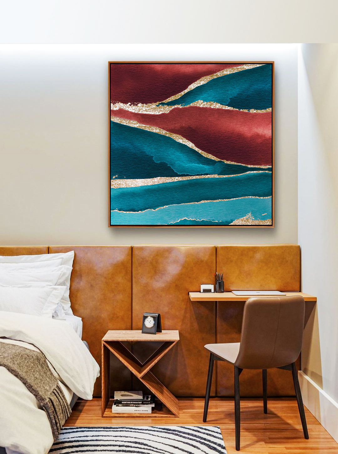 Cores vermelho, dourado e azul turquesa em arte abstrata moderna destacam energia, sofisticação e impacto visual. Arte decorativa com contraste marcante e estética atual, muito buscada na decoração. Valoriza salas, quadros e recepções.