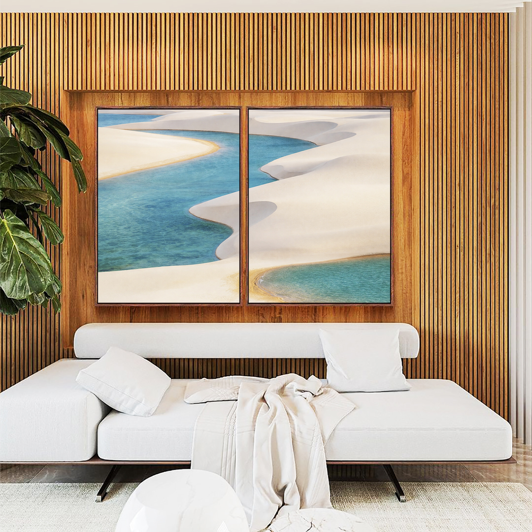 Duo de Quadros Dunas Areia Branca Mar Azul Claro Canvas Moldura
