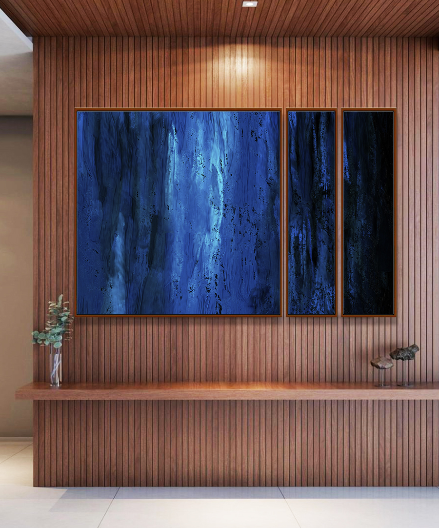 Com textura visual marcante e tons de azuis variados, este Trio de Quadros Estilizados traduz tranquilidade e elegância.
