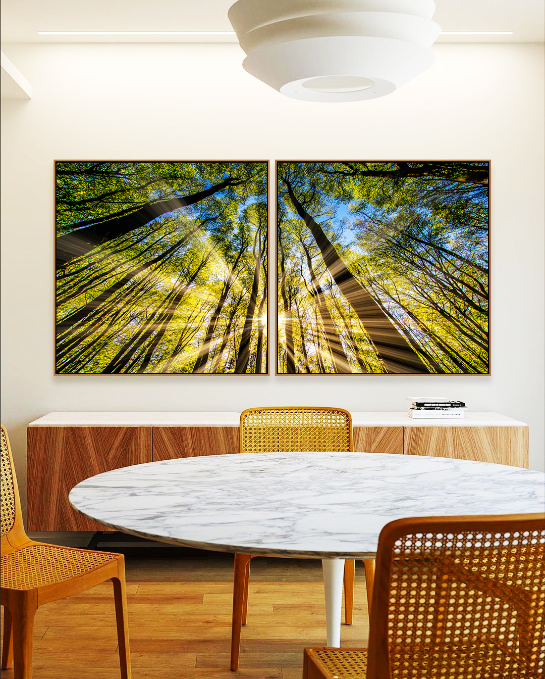 Este Duo de Quadros Quadrados exibe floresta iluminada pelo sol com céu azul e árvores vibrantes. Perfeito para salas, quartos ou escritórios, com moldura moderna em canvas, trazendo frescor, sofisticação e charme natural à decoração.