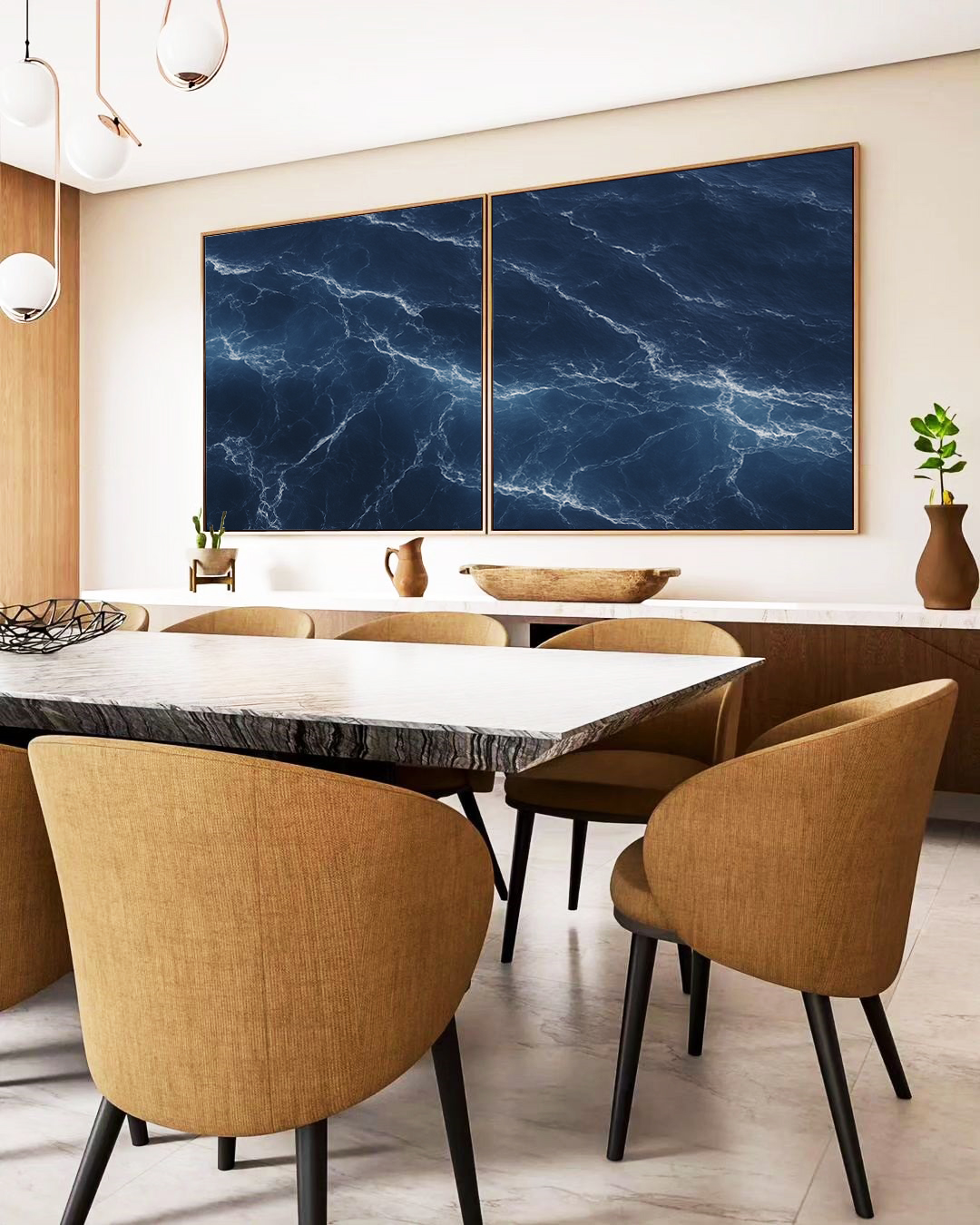 Intenso e sofisticado, este Duo de Quadros Quadrados retrata o mar alto em azul profundo, transmitindo força e elegância natural. A escolha ideal para salas refinadas, quartos elegantes, escritórios contemporâneos ou halls de entrada imponentes.