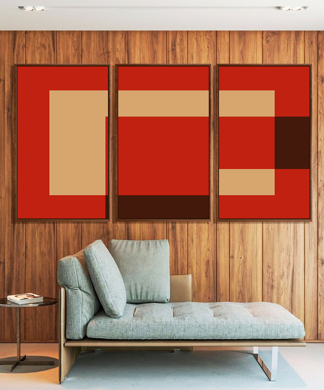 O contraste entre o vermelho e o marfim cria uma atmosfera moderna e acolhedora. Um Trio de Quadros de linhas geométricas que é a escolha certa para transformar sua sala, quarto ou hall em um ambiente cheio de estilo.