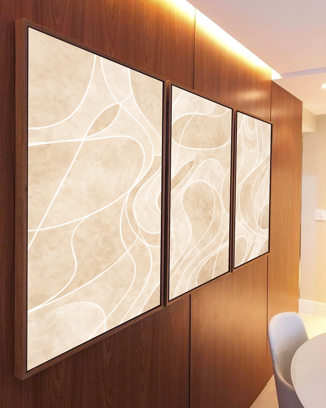 Suave e envolvente, este Trio de Quadros abstrato em contornos marfim e creme cria ponto focal sofisticado e elegante no décor. Ideal para compor salas modernas, quartos refinados ou escritórios elegantes. Belíssimo!