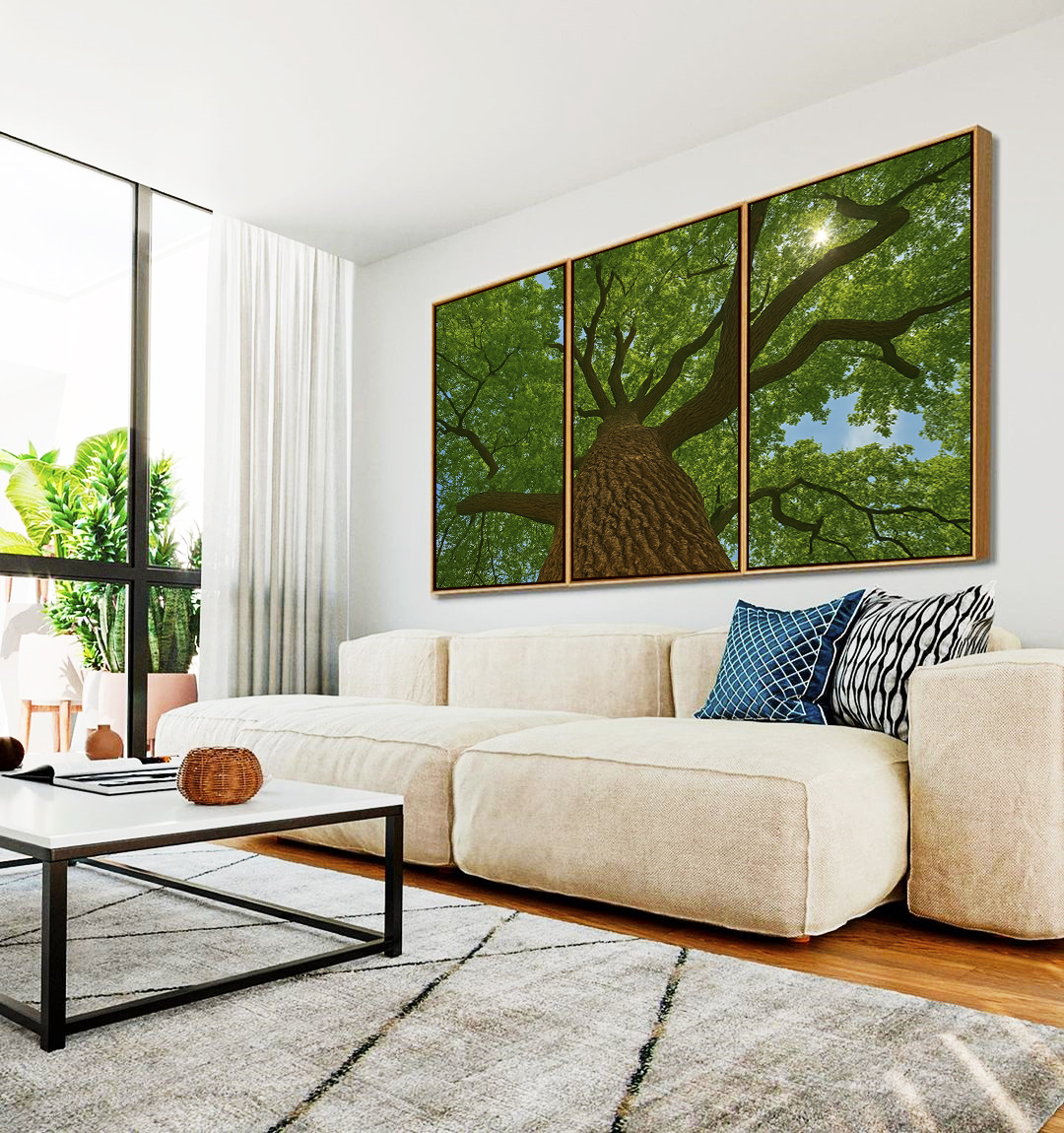 Sereno e sofisticado, este Trio de Quadros retrata a beleza da Natureza com folhas verdes e árvore em destaque, criando sensação de equilíbrio visual. Ideal para valorizar salas refinadas, quartos elegantes ou halls de entrada marcantes.