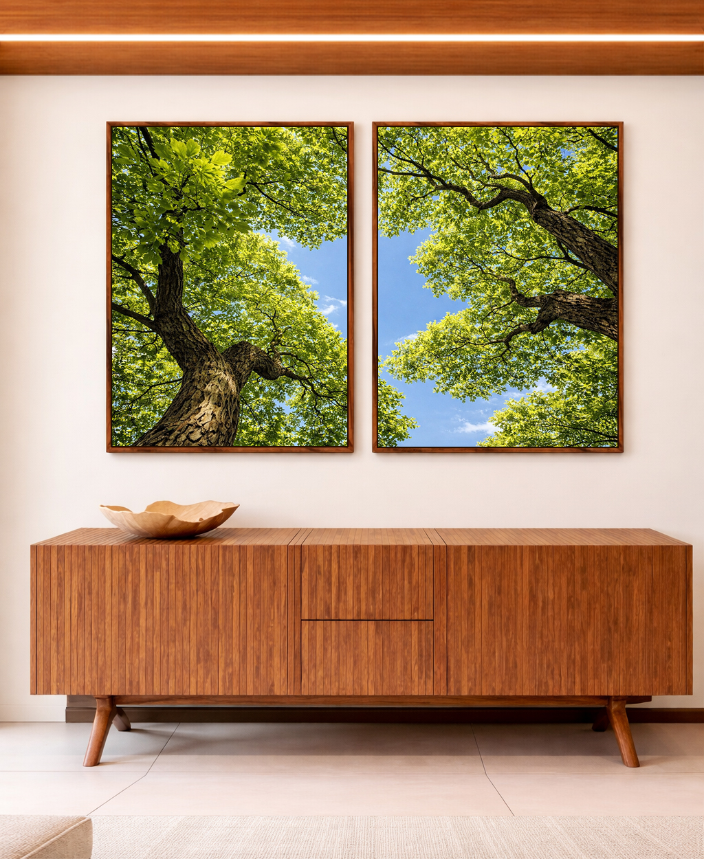 Árvores com folhagem verde sob um céu limpo criam uma atmosfera fresca e acolhedora. Ideal para salas, quartos e ambientes que buscam leveza, bem-estar e conexão natural no dia a dia.