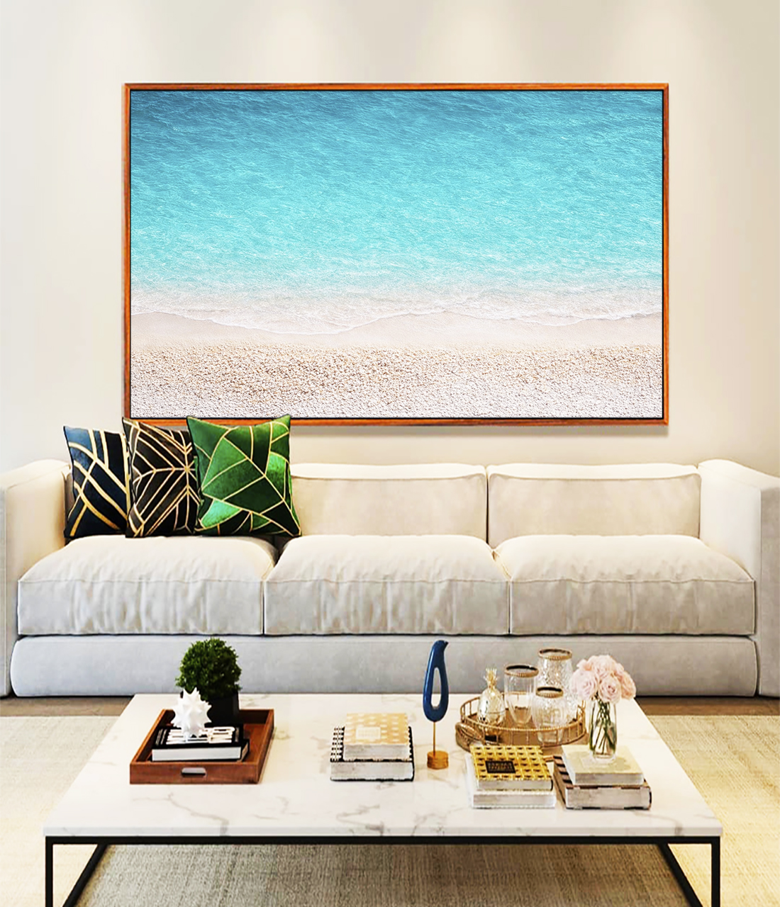 Natural e marcante, este Quadro Horizontal de praia com areia branca e mar azul turquesa cria ponto focal sofisticado e sensação de refúgio no ambiente. Ideal para compor salas modernas, quartos elegantes ou halls de entrada de destaque.