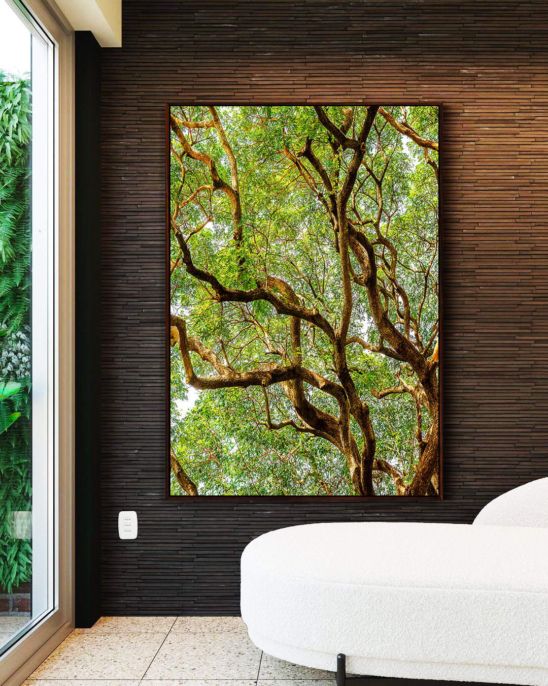 Eleve sua decoração com este Quadro Vertical da natureza, exibindo copa de árvore e folhas em detalhes únicos. Perfeito para seu Quarto, Sala ou Hall de entrada, criando um ambiente sereno e cheio de elegância. Moldura Flutuante de Excelente Qualidade!