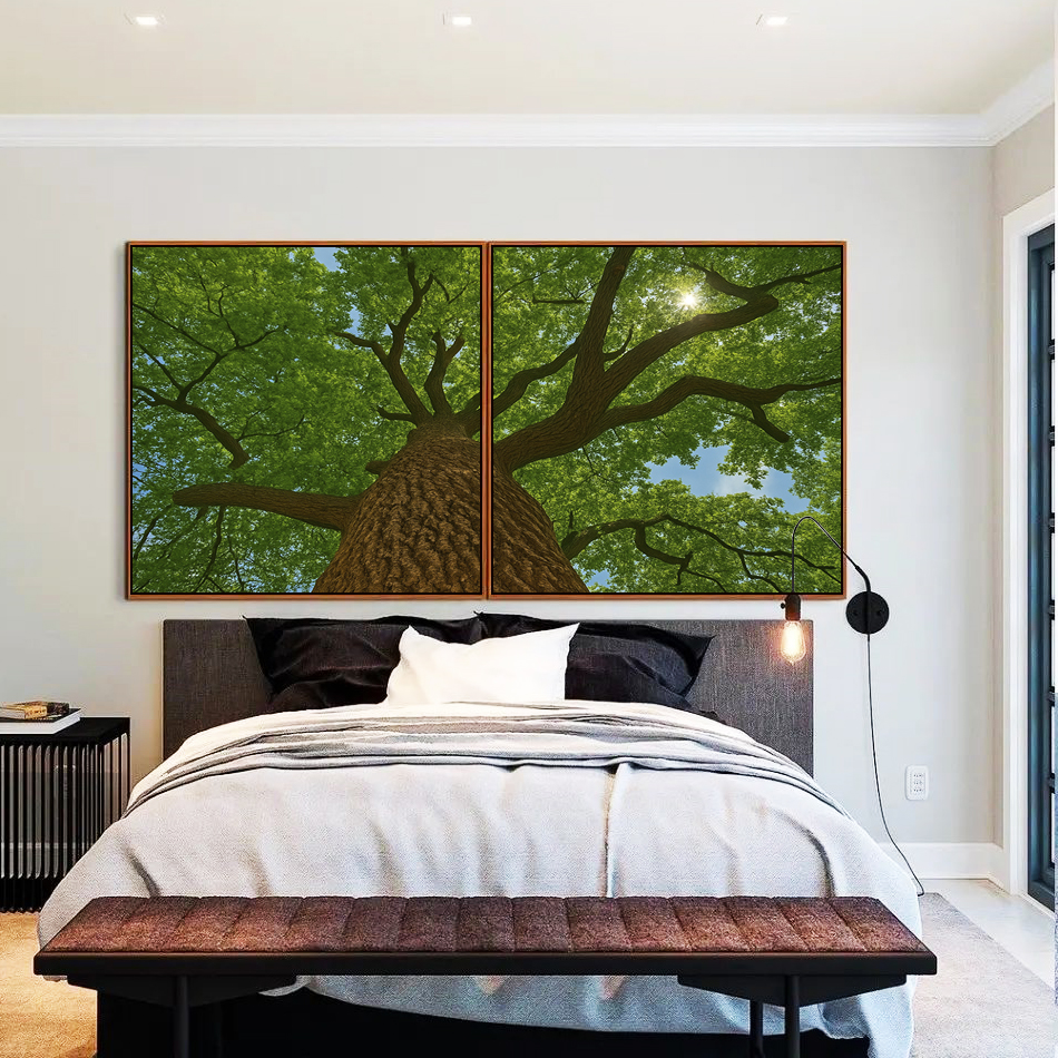 Sereno e sofisticado, este Duo de Quadros Quadrados retrata a beleza da Natureza com folhas verdes e árvore em destaque, criando sensação de equilíbrio visual. Ideal para valorizar salas refinadas, quartos elegantes ou halls de entrada marcantes.