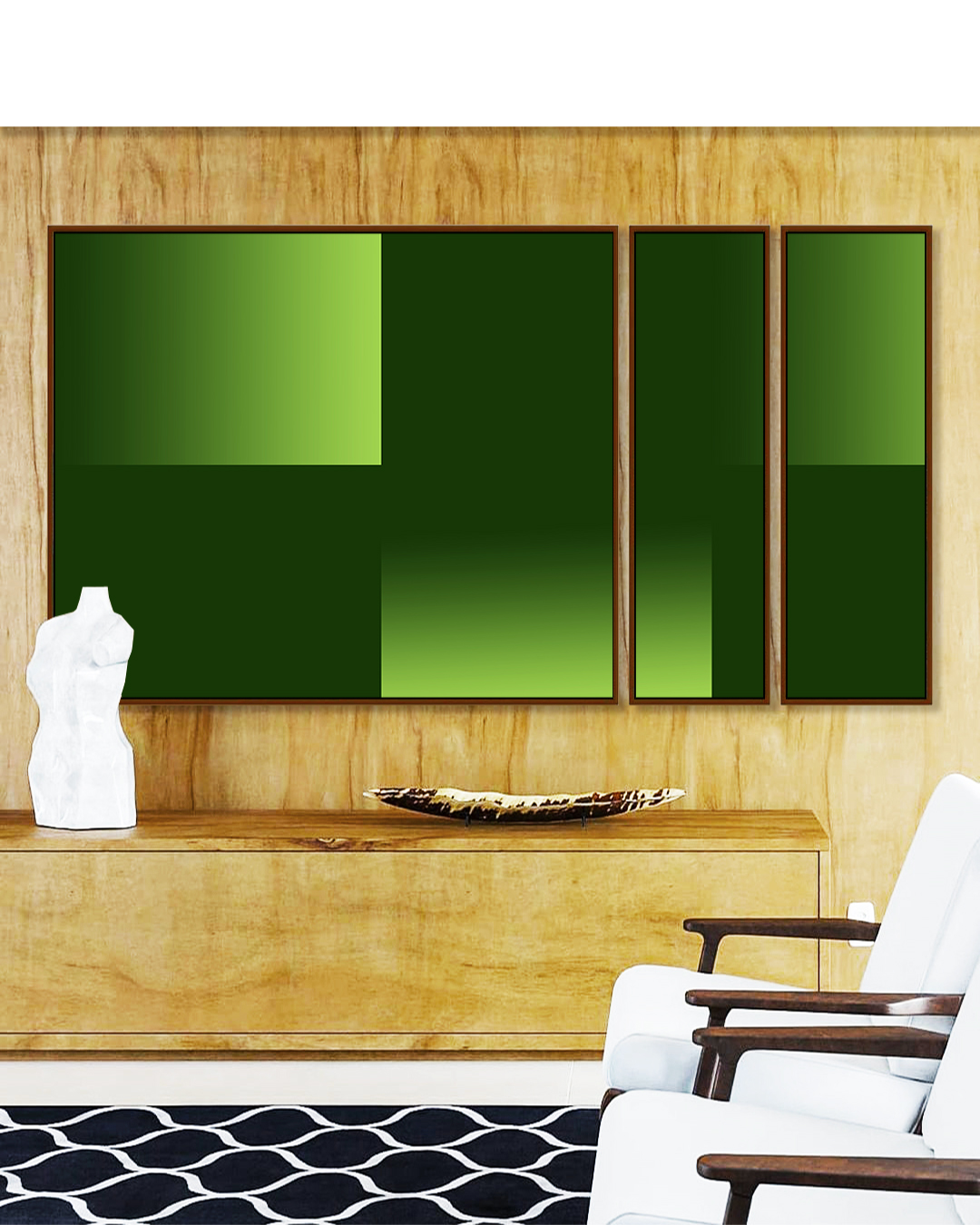 Trio de Quadros Estilizados Abstrato Degradê Geométrico Verde Limão Canvas Moldura