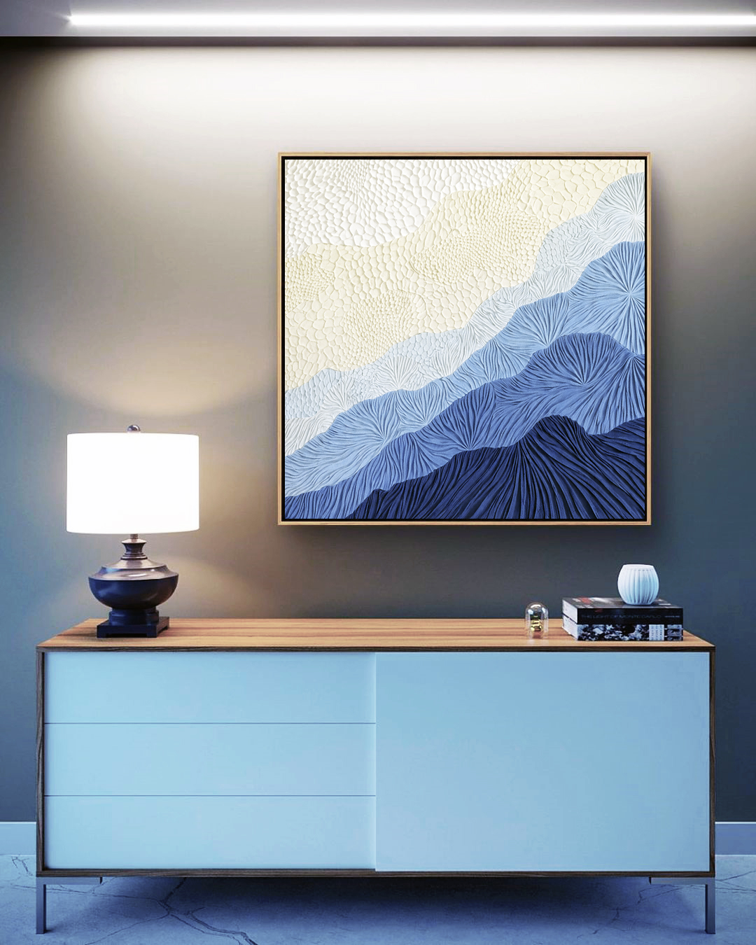 Com degradê abstrato em marfim e azul, a textura cria profundidade e leveza visual. Este Quadro Quadrado é ideal para salas sofisticadas, quartos contemporâneos ou escritórios modernos, elevando o ambiente com elegância e design refinado.