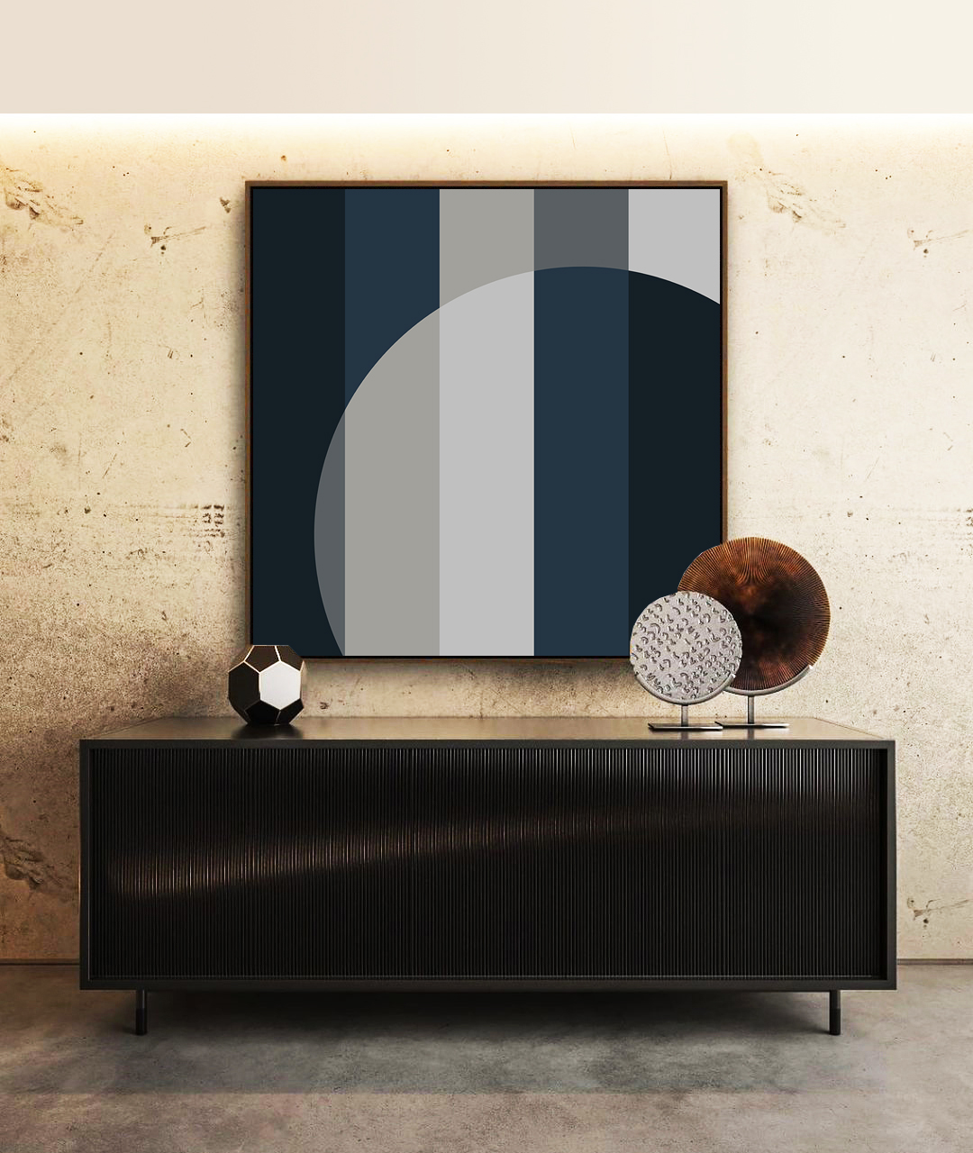 Este Quadro Quadrado combina listras e formas geométricas em azul e cinza, trazendo harmonia e estilo à decoração.