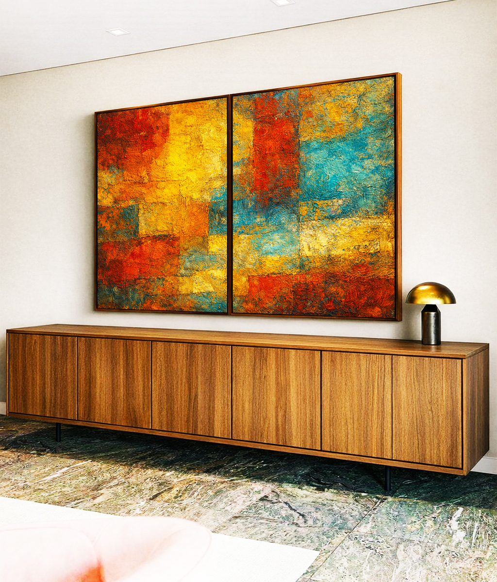 Duo de Quadros Abstrato Textura Amarelo Laranja Turquesa Canvas Moldura