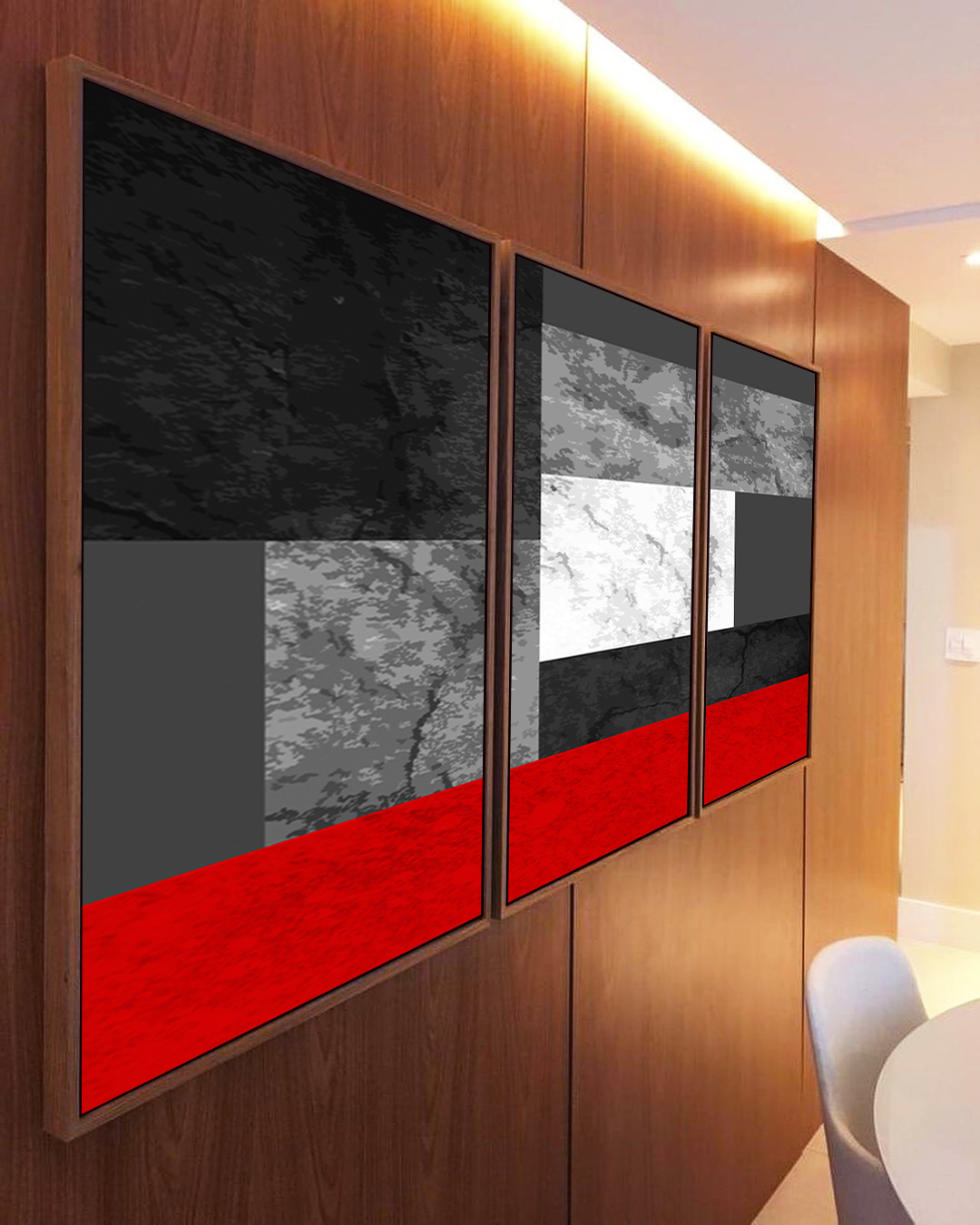 Abstrato geométrico com cinza concreto e vermelho, trazendo equilíbrio entre modernidade, elegância e impacto visual. Estilo contemporâneo ideal para quem busca decoração urbana e sofisticada.
