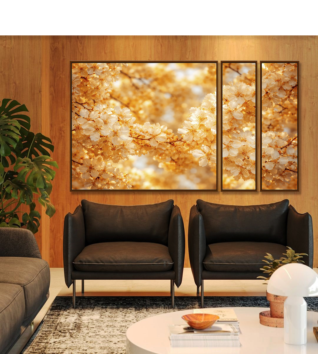 Trio de Quadros Estilizados Cerejeira em Flor Tons Dourados Natureza Canvas Moldura