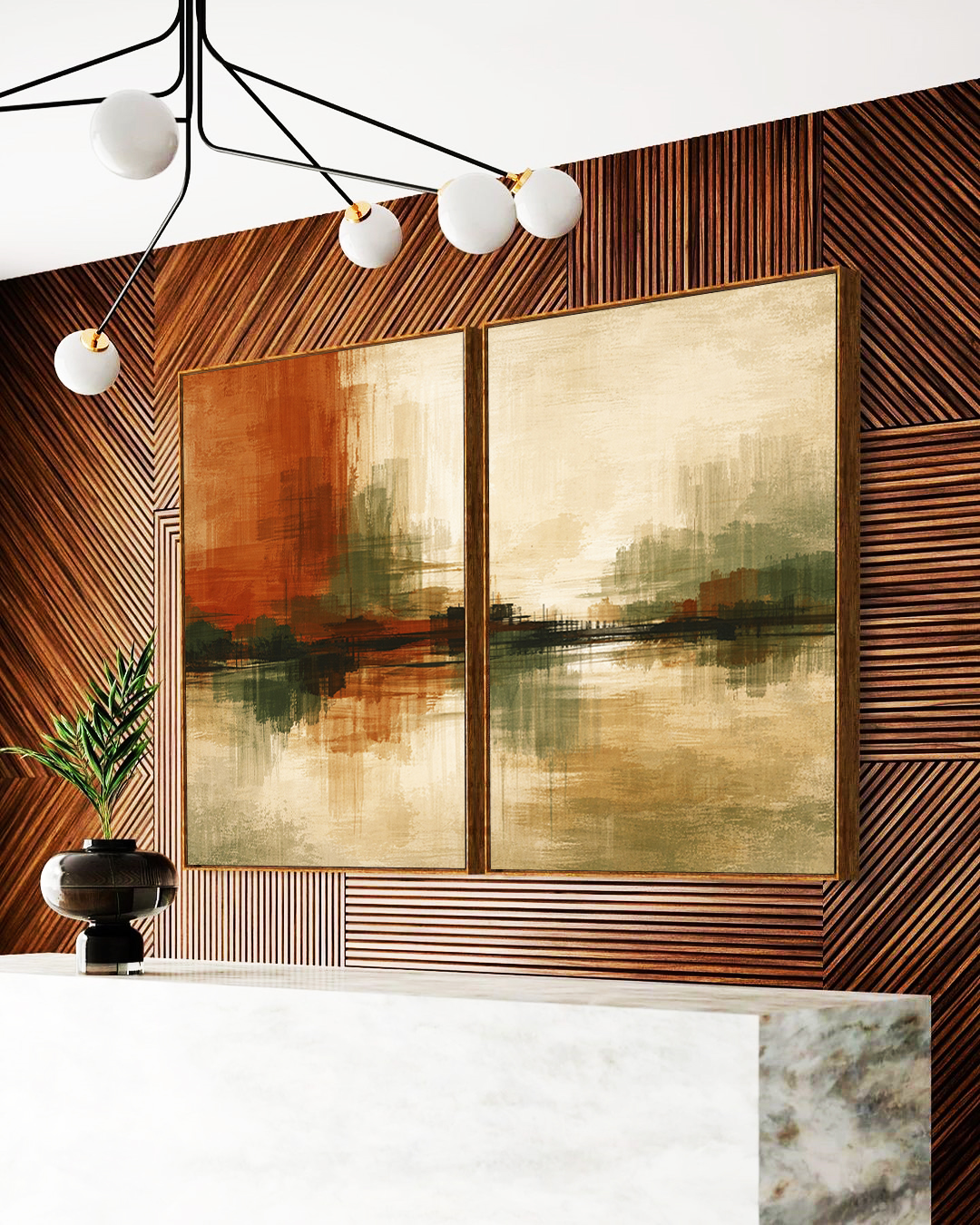 Tons de cobre, verde oliva, areia e creme criam uma atmosfera sofisticada e acolhedora. Ideal para salas, escritórios e ambientes que valorizam equilíbrio, elegância e uma estética natural contemporânea.