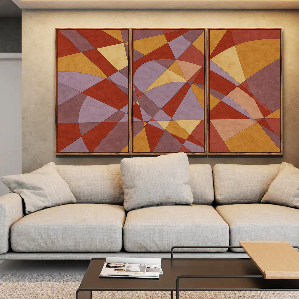 O Trio de Quadros abstratos em tons de vermelho, lilás, bronze e bordô oferece equilíbrio visual e estilo contemporâneo. Com moldura moderna, é ideal para compor salas sofisticadas, quartos elegantes ou halls imponentes, trazendo harmonia e impacto.