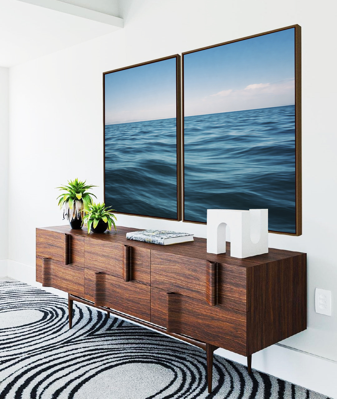 Duo de Quadros Oceano Azul Sóbrio Ondas no Mar Céu Sereno Canvas Moldura