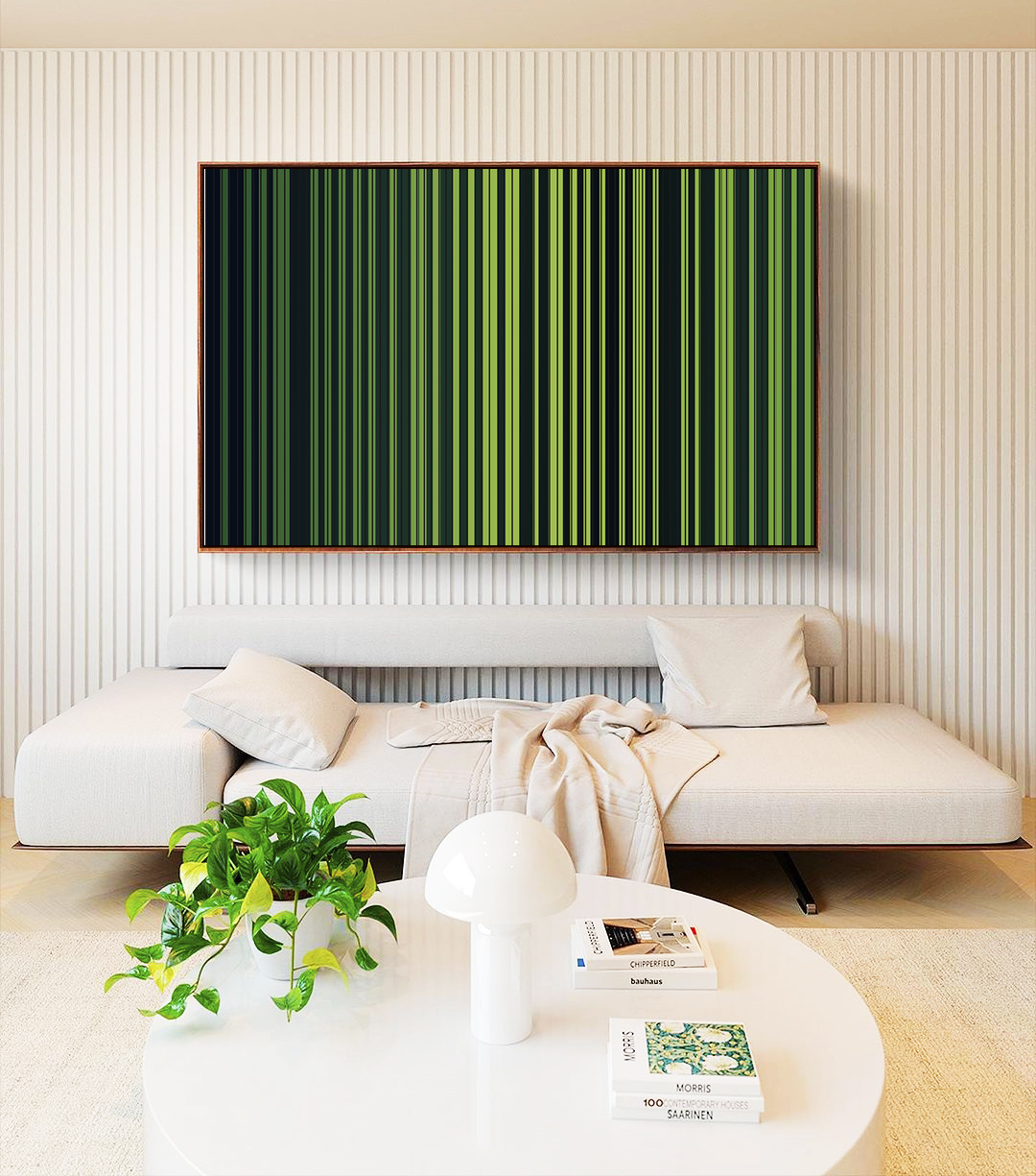 Com listras geométricas e transições de verde, este Quadro Horizontal abstrato traduz equilíbrio e refinamento. Ideal para salas amplas, escritórios ou halls de entrada, ele transforma o espaço com um visual atual e sofisticado.