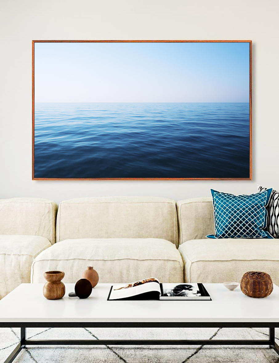 Este Quadro Horizontal captura a tranquilidade do mar calmo e do céu claro, trazendo sensação de frescor e bem-estar. Perfeito para compor salas, halls ou escritórios que valorizam serenidade e elegância.