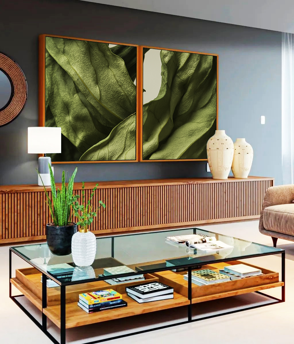 Com folhagens verdes em destaque, este Duo de Quadros traduz equilíbrio e sensação de bem-estar. Ideal para salas amplas, escritórios ou halls de entrada, ele transforma o ambiente com um toque natural, leve e sofisticado.