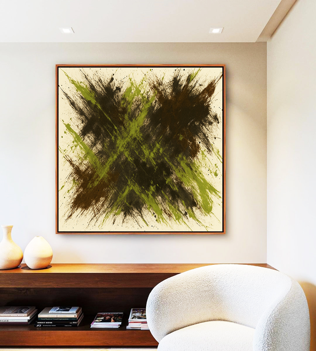 Este Quadro Quadrado combina nuances de verde pistache e marrom em um elegante efeito de pintura. A escolha certa para transformar salas, escritórios ou quartos, trazendo equilíbrio visual, modernidade e um toque artístico refinado.