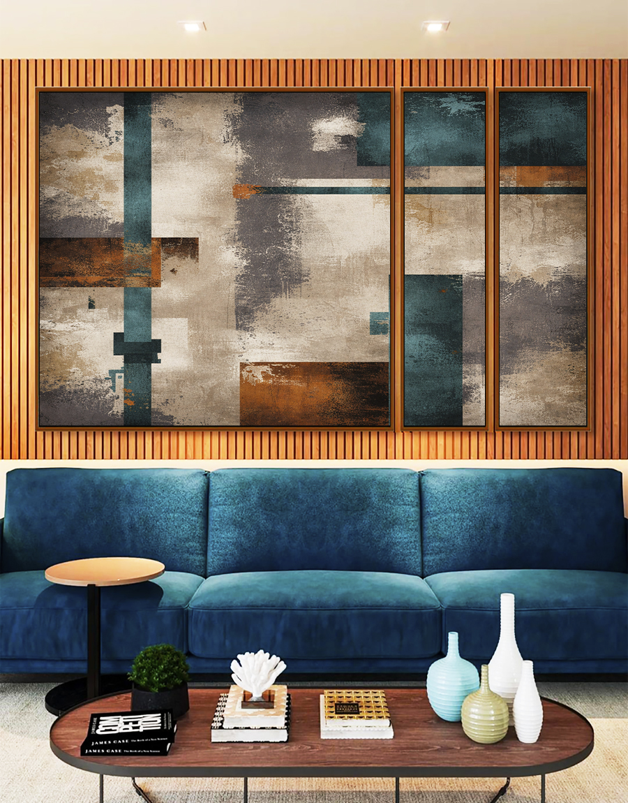 Arte abstrata com tons de azul, bronze e cinza concreto, trazendo um visual urbano e sofisticado. Ideal para salas, escritórios e ambientes modernos que buscam personalidade e elegância na decoração.