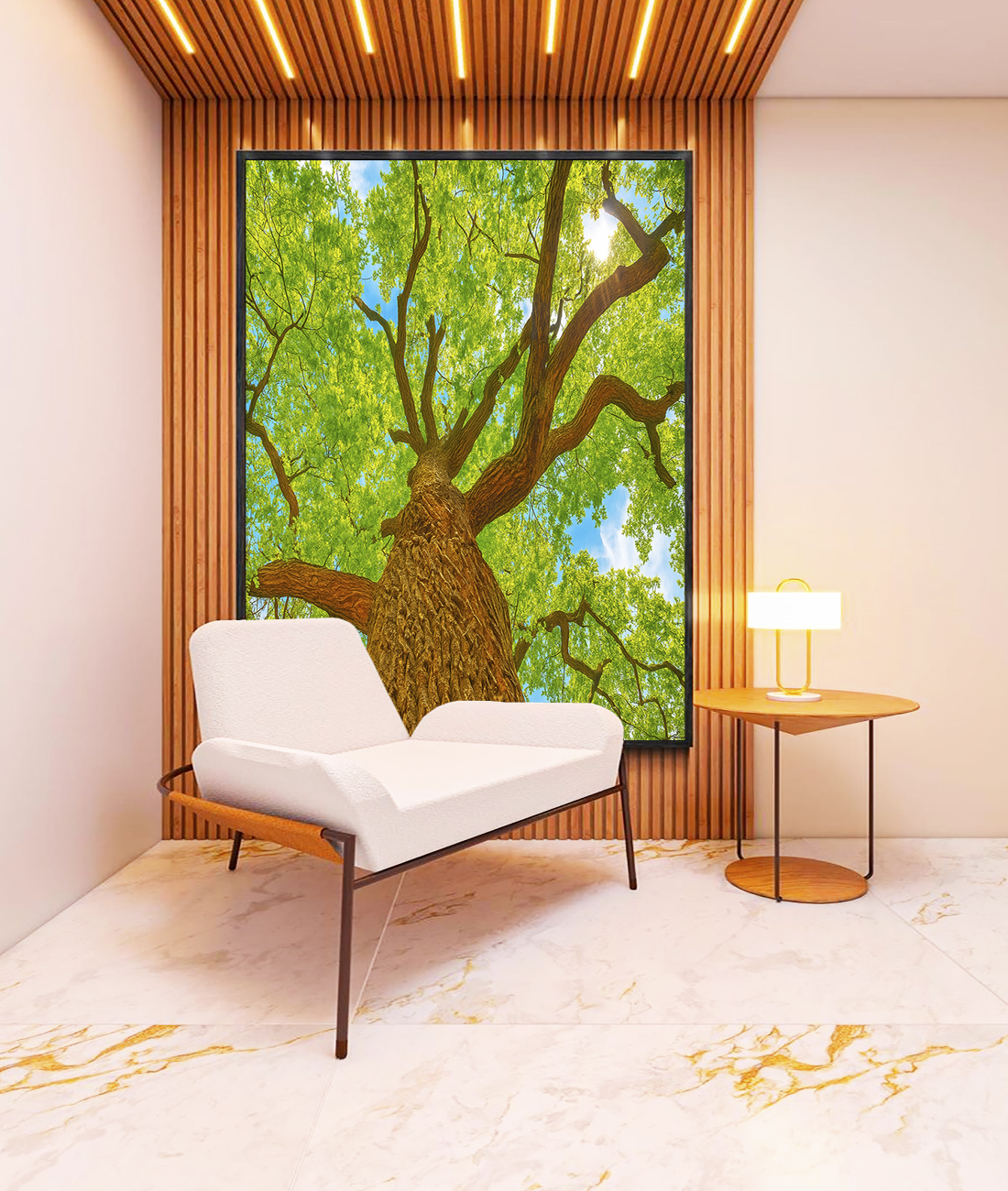 Com árvore em destaque e luz natural filtrada pelas folhas verdes, este Quadro Vertical transmite harmonia e bem-estar. Ideal para salas amplas, escritórios ou halls de entrada, transformando o ambiente com sofisticação natural.