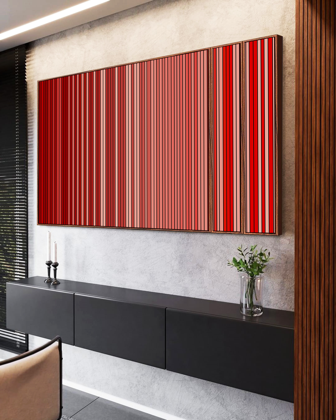 Arte contemporânea em destaque com este Trio de Quadros Estilizados abstratos em degradê Vermelho carmim e salmão. Produzidos em canvas com moldura flutuante, são perfeitos para dar vida a salas de estar, escritórios modernos e halls de entrada elegantes.
