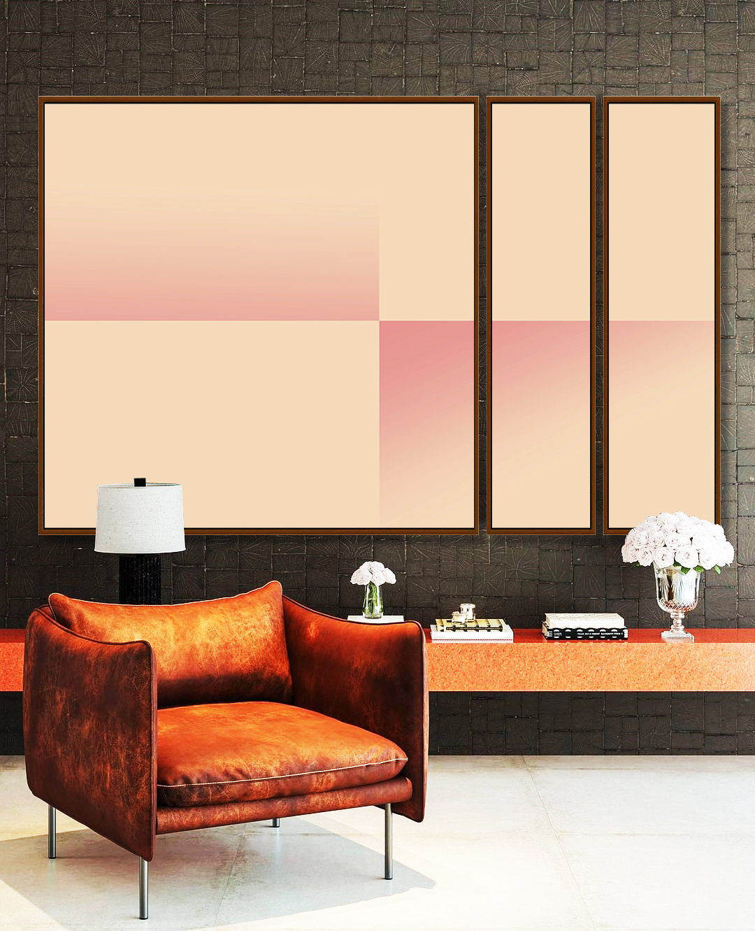 Este Trio de Quadros Estilizados com degradê geométrico em tons de rosa cria uma atmosfera suave e moderna. A escolha ideal para salas, quartos ou halls de entrada que buscam delicadeza, harmonia e um toque contemporâneo de sofisticação.
