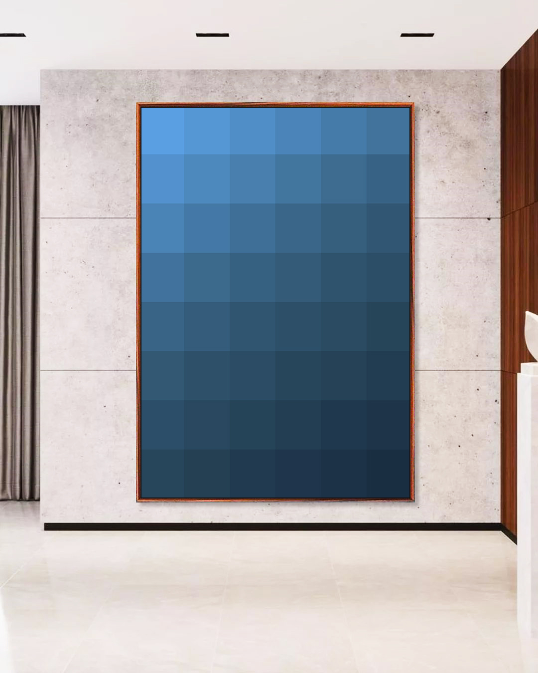 Moderno e sofisticado, este Quadro Vertical geométrico em degradê azul cria profundidade e equilíbrio visual no ambiente. A escolha ideal para salas elegantes, quartos refinados, escritórios contemporâneos ou halls de entrada com estética atual.