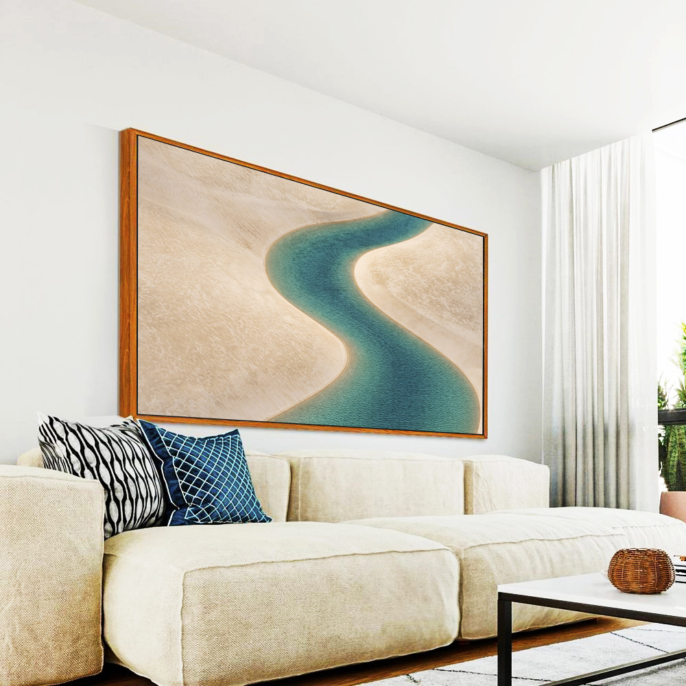 Água turquesa contrastando com dunas de areia branca cria uma atmosfera leve, sofisticada e relaxante. Estética natural com toque contemporâneo que valoriza a decoração. Perfeito para salas, quartos e escritórios com proposta clean.
