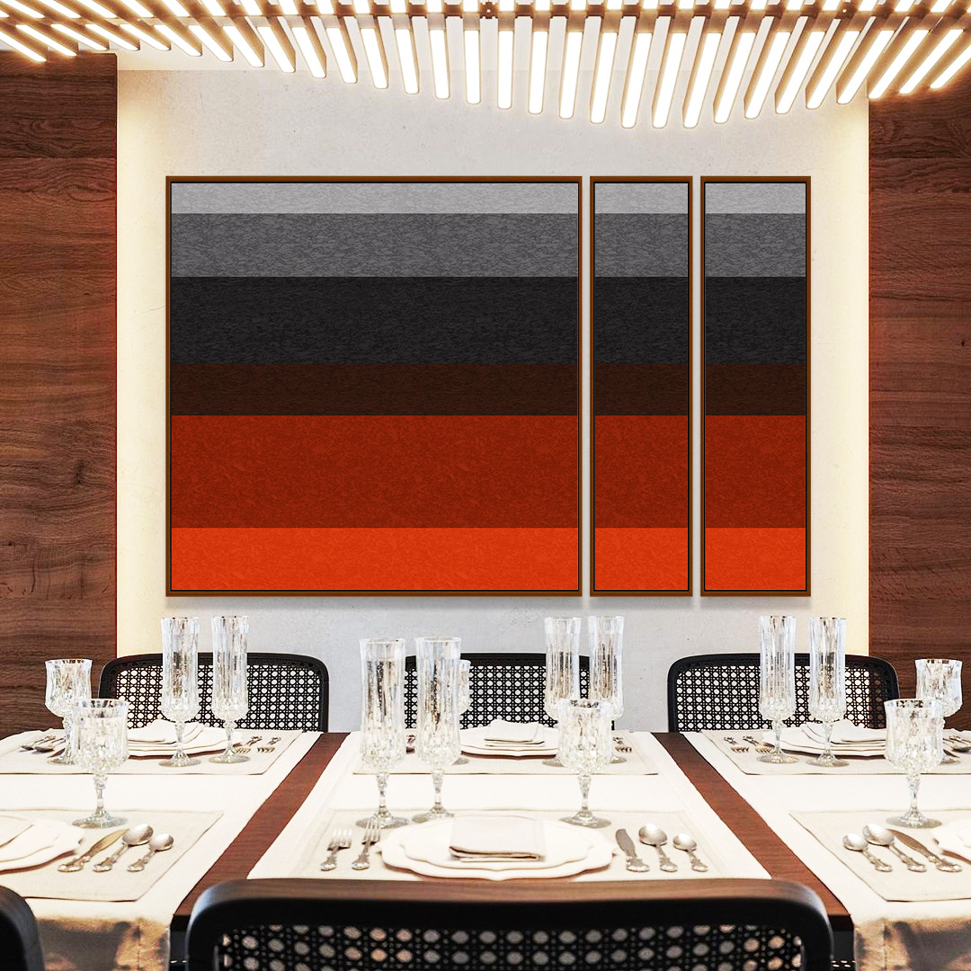 Tons de cinza equilibrados com laranja vibrante criam um efeito visual moderno e acolhedor. Estética abstrata com textura que transforma o espaço com elegância. Ótima opção para salas, quartos e escritórios.