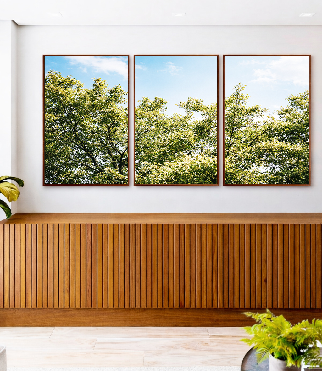 Árvores com folhagem verde sob céu claro com nuvens criam paisagem natural leve e luminosa. Inspiração em natureza, ar livre e tranquilidade que traz frescor à decoração contemporânea. Perfeito para quartos de dormir, salas de estar ou escritórios.