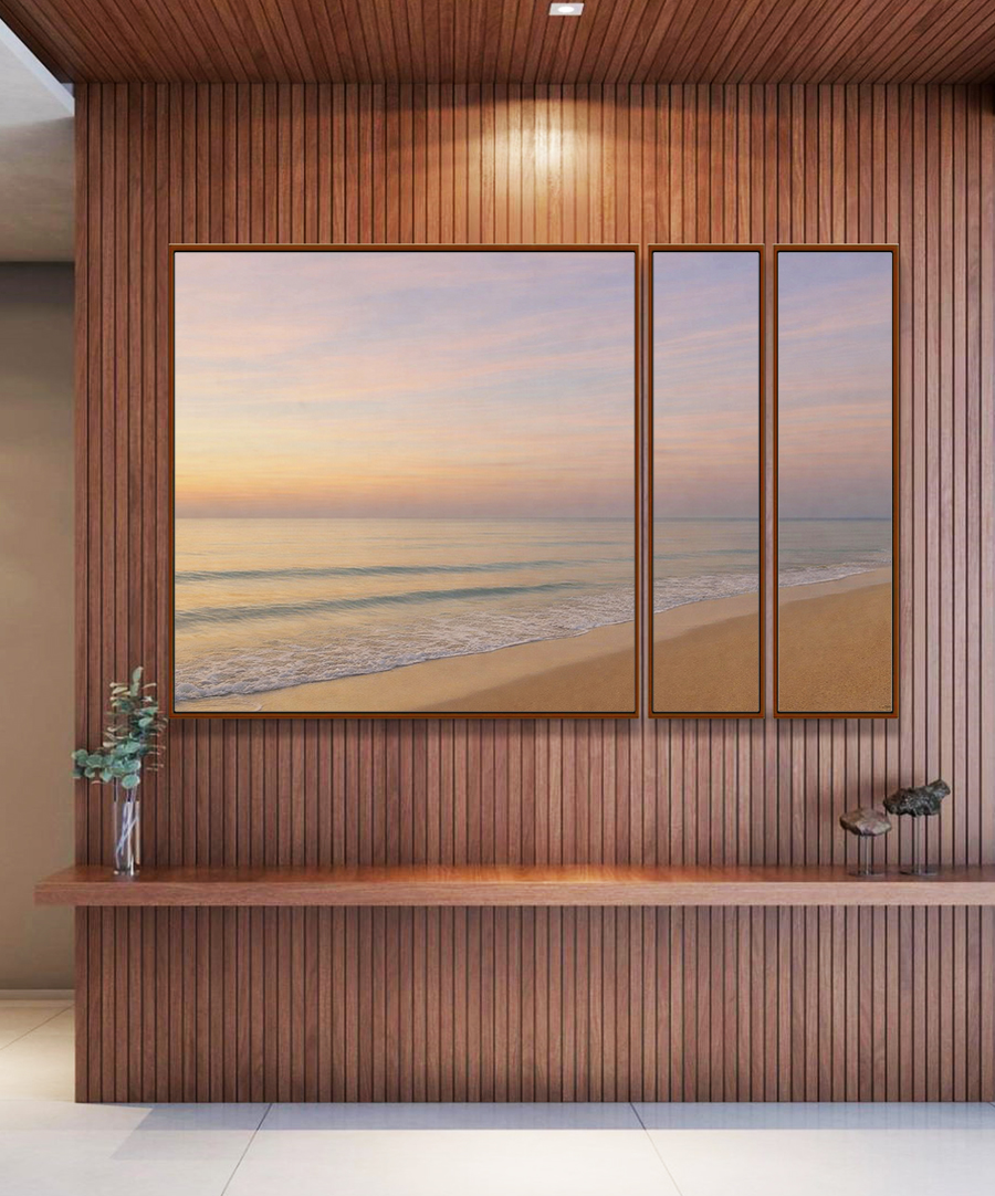 Sereno e encantador, este Trio de Quadros Estilizados com nascer do sol lilás sobre praia serena e mar azul prateado cria atmosfera leve e sofisticada. A escolha ideal para salas elegantes, quartos tranquilos, ou escritórios modernos.