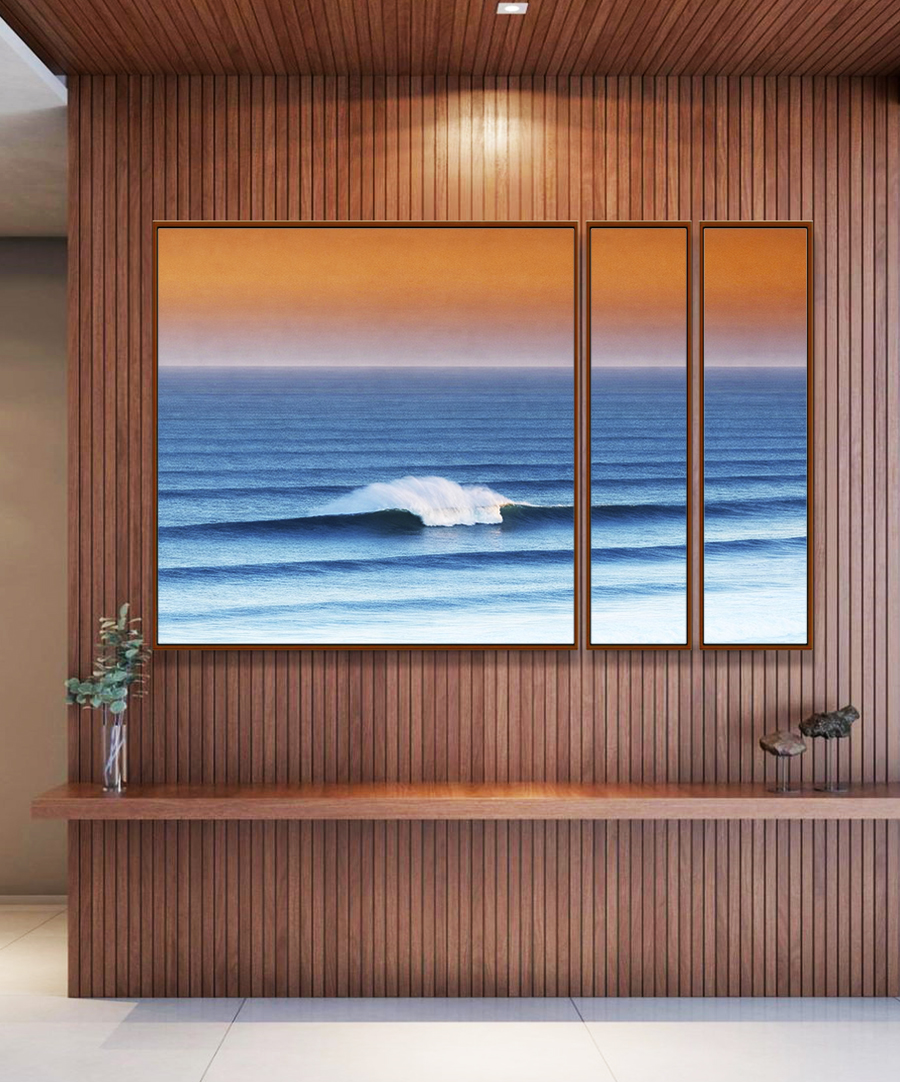 Ondulações no mar azul encontram o calor do pôr do sol laranja em uma Arte marcante. O Trio de Quadros Estilizados é ideal para decorar salas de estar, escritórios sofisticados ou quartos, adicionando arte, profundidade e emoção à decoração.